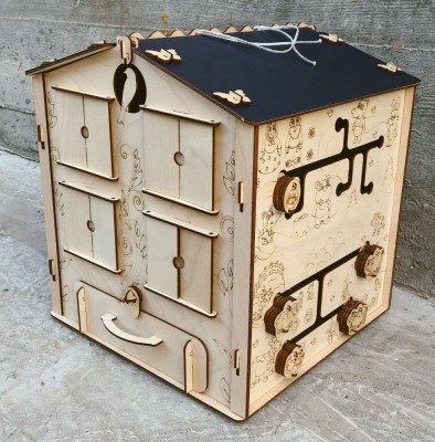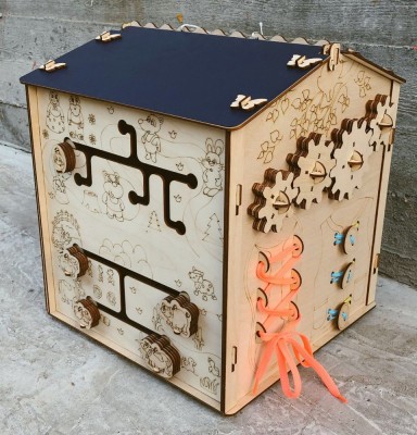 Сторона №4 поражает своей оригинальностью: там можно обыгрывать сюжеты двух русских сказок, передвигая героев по сюжетной линии. На крыше бизибокса можно рисовать мелом.