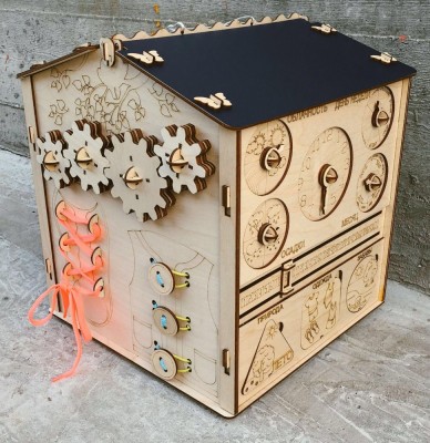 С одной стороны, ребенок имеет возможность крутить передачи и развивать пальцы с помощью шнурков и пуговок. А если бизибокс развернуть, можно изучать времена года, правильно заменяя деревянные карточки. Также можно изучить время: для этого есть целых 5 стрелочных часов! Шкала со слайдером может увлечь даже взрослого.