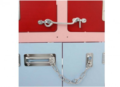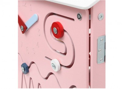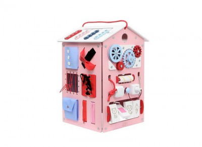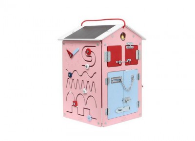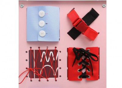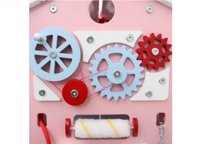 Шестеренки, выключатель, валик, розетка, шнур и цепочка, вращающиеся карты с картинками, четыре цветные дверцы, колокольчик, шпингалет, крючок, дверная цепочка, форточная завертка, засов для замочков, стрелки, циферблат и лабиринты, пуговицы, молнии, липучка, карабин, карман с кнопкой и два вида шнуровки.