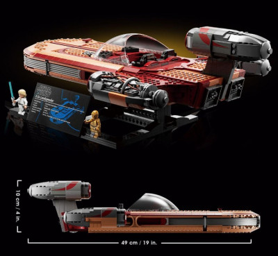 Сборка и демонстрация Сборная модель автомобиля имеет длину около 49 см и оснащена подставкой для создания эффекта парения. В коробке также есть табличка с характеристиками спидера X-34, две минифигурки - Люк Скайуокер со световым мечом и электросеткой, а также украшение C-3PO, новое для мая 2022 года.