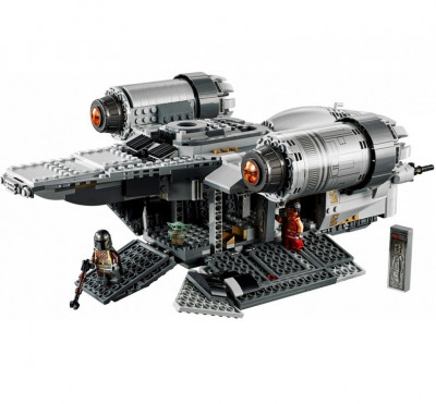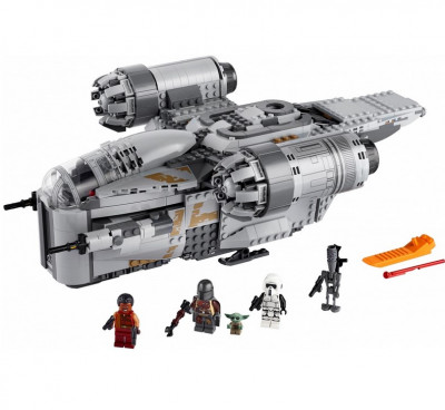 Из деталей набора собирается огромная летающая крепость Лезвие бритвы, являющаяся межгалактическим кораблем знаменитого воина из киновселенной Звездные Войны, мандалорца по имени Дин Джарин. Основной цвет модели корабля – серый. Космолет имеет просторную двухместную кабину, в которой удобно располагаются минифигурки главных героев. В верхней части летательного аппарата расположены два мощных двигателя. Силовые агрегаты установлены на небольших крыльях, в основании которых имеются пружинные шуттеры, необходимые для ведения стрельбы по врагам.