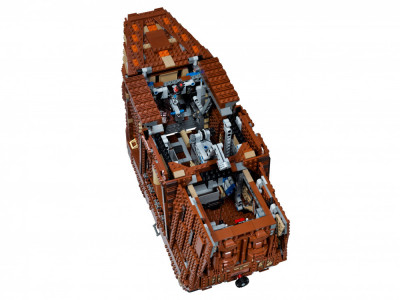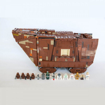 Песчаный краулер представляет собой мощный бронированный танк, предназначенный для перевозки дроидов и техники по пустынным просторам планеты Татуин. Его монолитная конструкция выполнена из коричневых и бежевых деталей.
