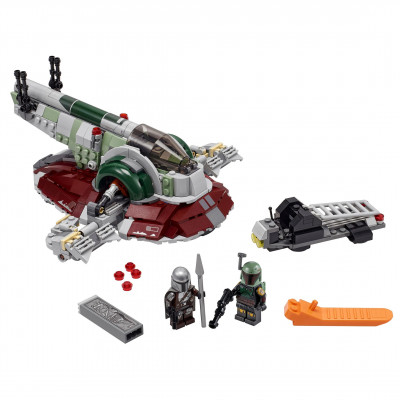 - В наборе есть две минифигурки: Боба Фетт с бластером и Мандалорец со своей бластерной винтовкой и копьем из бескара. Карбонитовый блок расширяет возможности творческой игры.