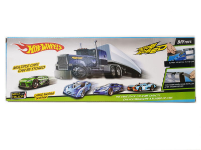 В фирменной коробке находится грузовик внушительных размеров с удобной ручкой сверху. Грузовик можно будет брать с собой куда угодно или просто прятать в него игрушки-машинки. Боковая стена кузова раскладывается в площадку. Здесь можно или парковать машинки.