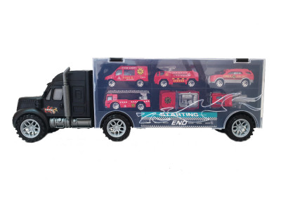 Внутри кабины находятся дорожка, по которой можно съехать вперед грузовика. В набор входят шесть машинок.