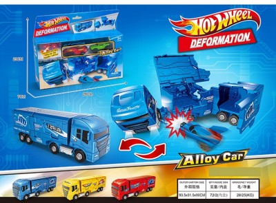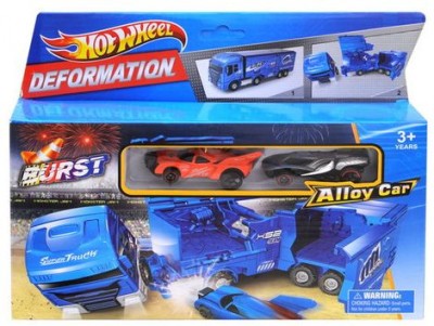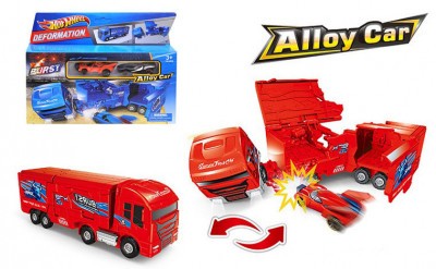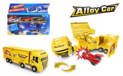В фирменной коробке находится грузовик с металлической кабиной и пластиковым прицепом. Машинки сделаны из металла.