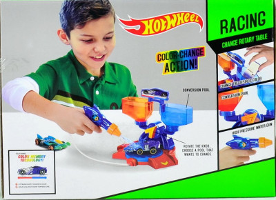 В набор входит база с автомойкой, пистолет для мойки и 2 бассейна для мытья машинки. Наполните бассейны холодной и горячей водой и увидите как машинка меняет цвет при погружении.