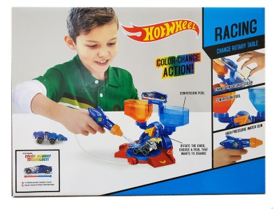 В набор входит база с автомойкой, пистолет для мойки и 2 бассейна для мытья машинки. Наполните бассейны холодной и горячей водой и увидите как машинка меняет цвет при погружении.