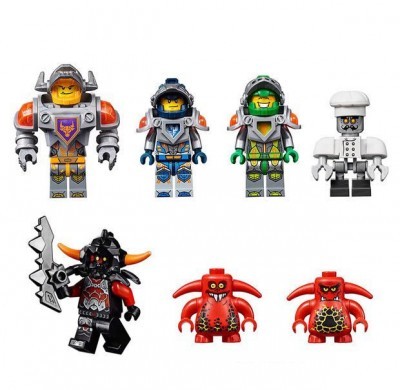 Но это еще не всё! Из деталей конструктора можно собрать мотоцикл Клэя, Аэромолот Аарона и летающий мобиль Пеплометателя. В комплект входят 7 фигурок с аксессуарами: Клэй, Аарон, Аксель, шеф-повар Эклер, Пеплометатель и 2 Шустрика, а также Книга Зла и 5 щитов для сканирования с НЕКСО Силами: «Сила земли», «Сверхскорость», «Клич Ястреба», «Куриная Атака» и «Электрическая Атака».