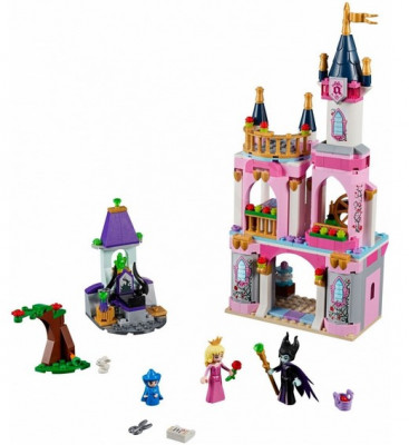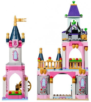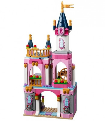 Из деталей набора Вы сможете построить замок Спящей красавицы. Его фасад выполнен в бело-розовом цвете с добавлением позолоченных элементов. Внизу видны каменные стены, обвитые цветущими растениями, а наверху – синяя черепичная крыша с башенками, гербом и флагом.