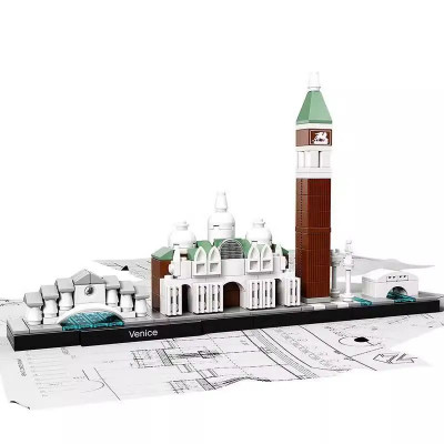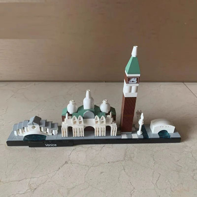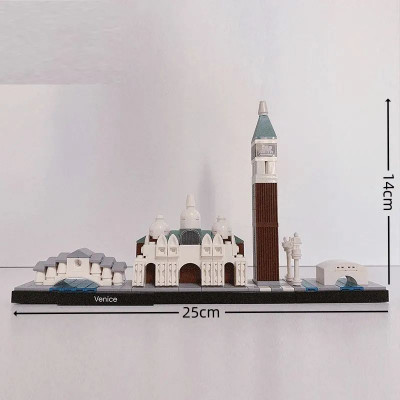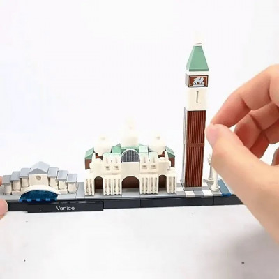 Все здания располагаются на прямоугольной плите, служащей выставочным дисплеем с названием. На поверхности плиты нанесены элементы белого и серого цвета, напоминающие покрытые мрамором площади и мостовые. Голубые прозрачные детали наглядно демонстрируют многообразие водных каналов, пронизывающих город. Через самый широкий из них - Гранд-канал, построен мост Риальто. Это первый и в тоже время самый узнаваемый мост Венеции.