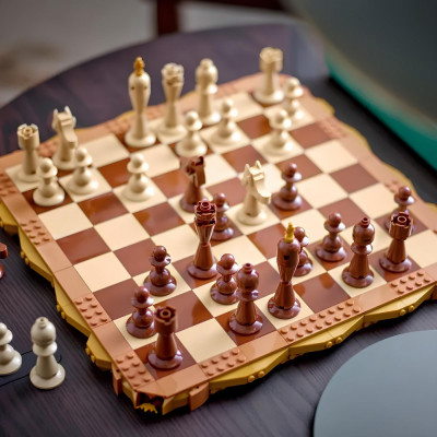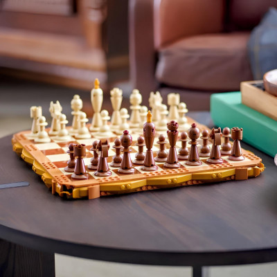 По сравнению с традиционными деревянными шахматными наборами, этот набор выполнен из деталей и имеет элегантный и традиционный вид. Квадраты шахматной доски состоят из 8x8 чередующихся черных и белых (или темных и светлых) квадратов, создавая типичный рисунок шахматной доски. Фигуры же собраны из деталей и по форме и цвету напоминают традиционные деревянные шахматные фигуры.