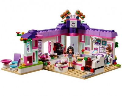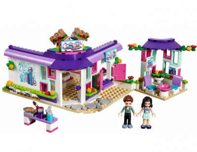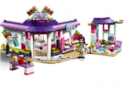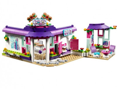 В наборе Вы найдёте модель арт-кафе Эммы. Его белые стены прекрасно гармонируют с окошками, чьи рамы выкрашены в цвет мяты и фуксии. На фиолетовой крыше видна массивная вывеска с двумя сэндвичами и оригинальной палитрой художника. Вдоль здания располагаются бордюры с растениями и цветами. К главному входу ведёт круглая тротуарная плитка, уложенная поверх песчаной дорожки.
