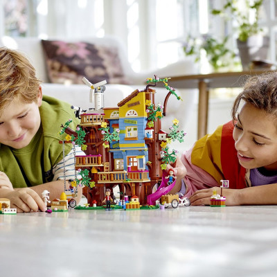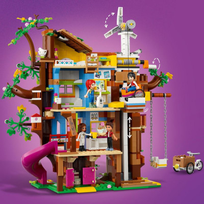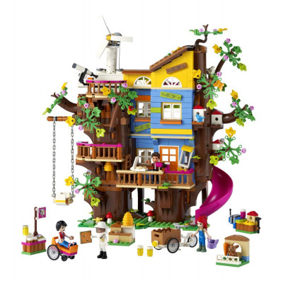 В собранном виде высота и ширина конструкции набора Френдс составляет более 30 см, а глубина 13 см. В домике есть все необходимое для комфортной жизни друзей, это и кухня, где можно приготовить различные вкусные блюда, спальня, гостиная и даже рабочий кабинет. Попасть в дом можно с помощью откидной лестницы или специального лифта, который работает от энергии ветра. Поднявшись на самый верхний этаж, ночью можно понаблюдать в телескоп за звездами. А быстро и весело спуститься вниз можно с помощью извилистой горки. Неподалеку на лужайке есть домик с кроликом, улья с пчелами, а также станок, на котором можно изготовить скворечник.