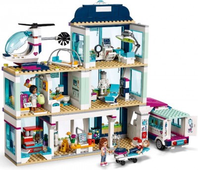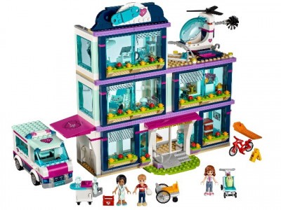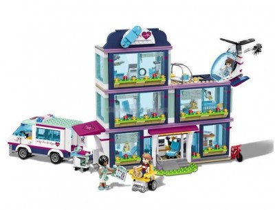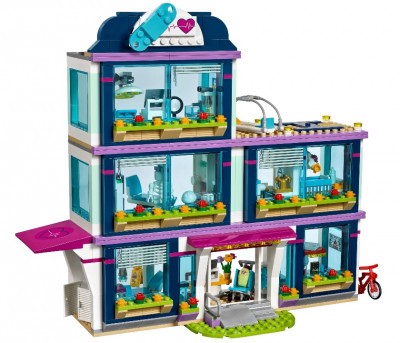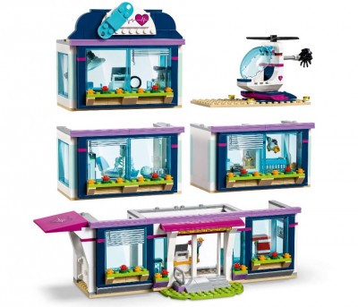 Из деталей набора Вы можете построить масштабную модель городской клиники. Её фасад выполнен в сине-белом цвете с добавлением фиолетовых полос. Внизу виден прочный фундамент, а наверху – крыша с яркой вывеской. На каждом из трёх этажей есть панорамное остекление, жалюзи и подоконники, украшенные цветами.