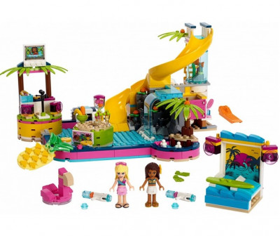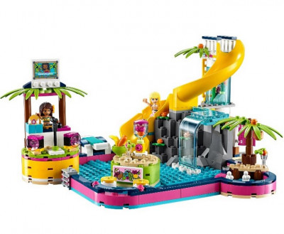 Закажи на нашем сайте конструктор и вместе с подружками посети вечеринку у Андреа. Вот она сама за диджейским пультом микширует музыку и поет. А Стефани съезжает в бассейн прямо с горки. Девочки могут покататься на сёрфинге на искусственных волнах, пострелять из водного пистолета или поплавать на розовом круге-Фламинго.