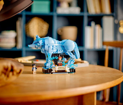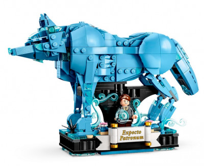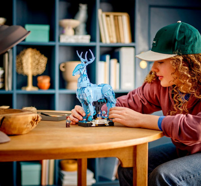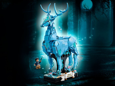 - Патронус-олень — имеет подвижные ноги, полупрозрачные светло-голубые элементы для призрачного вида и встроенную подставку с декоративными элементами и местом для минифигурки Гарри Поттера .