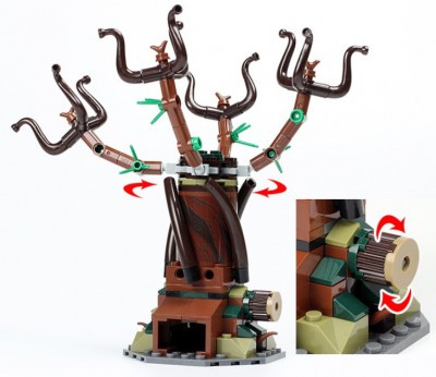 Гремучая Ива. Собирается из коричневых и зеленых деталей. В основании дерева есть тайник для одной фигурки. В кроне размещен механизм вращения веток. Как помним по книге, Гремучая Ива посажена для того, чтобы отпугивать мимо проходящих существ. Именно в ветках Ивы и запутывается Фордик.
