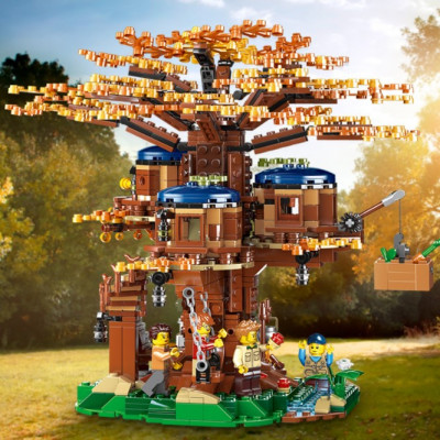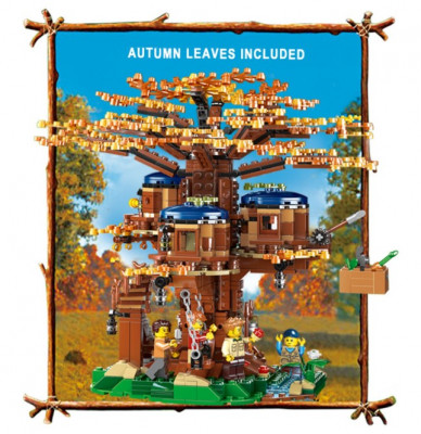 Данная модель конструктора очень уникальна и сложна. Цветовую гамму своего домика ты можешь выбирать самостоятельно. В домике живёт семья из 4-ёх человек: мама, папа, двое детей и маленькая птичка. На нижнем уровне расположен столик с 4-мя сидениями для главных героев, качели, аксессуары для пикника, спрятанный драгоценный камень и лестница для того, чтобы можно взбираться в хижины. Создай свой уникальный домик на дереве и придумай свой сюжет игры