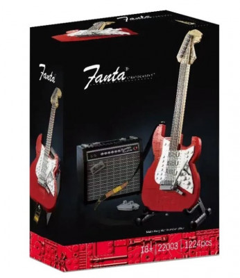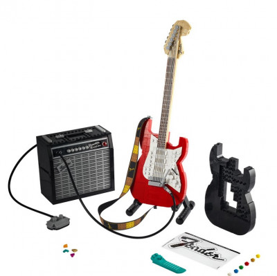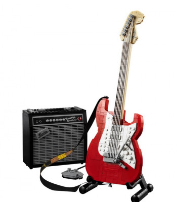 - У гитары подвижный рычаг тремоло, переключатель звукоснимателей и колки для настройки, шесть струн, наклейки и ремень. Кубики в наборе позволяют собрать гитару красного или черного цвета.