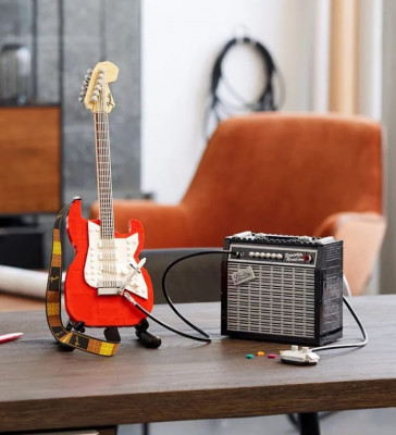 Приготовьтесь устроить рок! В этом поможет гитара 1970-х годов и усилитель. Соберите гитару красного или черного цвета и оцените такие аутентичные детали, как рычаг тремоло, переключатель звукоснимателей и колки для настройки. Изучите материнскую плату, ревербератор и динамик усилителя. Поместите гитару на подставку и подключите усилитель к гитаре и педали, чтобы завершить классное украшение интерьера.