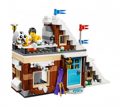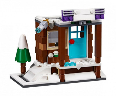 В наборе присутствуют 2 минифигурки и множество аксессуаров для игры: лыжи, лыжные палки, сноуборд, защитный шлем, стол со скамейками, стул, камин, костёр, фонари, флаги, ёлочка, кофеварка, кружки, прилавок и кассовый аппарат.