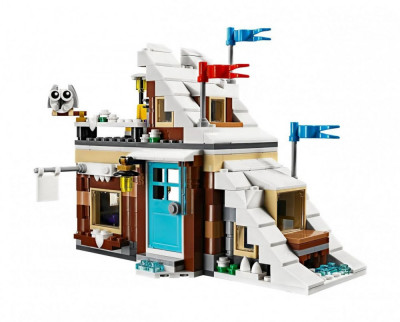 Из деталей набора Вы сможете построить модель зимнего дома. Его стены выполнены из крепких коричневых брёвен, базирующихся на каменном сером фундаменте. Крыша, козырьки и подоконники покрыты толстым слоем снега. Кое-где видны свисающие сосульки. Фасад украшен небольшой вывеской, элегантным фонарём, разноцветными флагам и флюгером в виде совы.