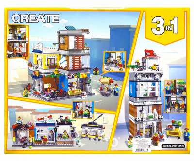 При желании, выполни замену сборных модульных секций или поменяй местами этажи строения, чтобы построить собственное городское здание. Используя элементы конструктора серии Creator, можно собрать трехэтажное здание Банка с обустроенной террасой на крыше. Из деталей набора Таунхаус можно также построить шумную Торговую улицу с трамваем и павильонами парикмахерского салона, стоматологического кабинета и магазина.