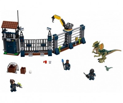 В комплект входят: подвижная фигурка Дилофозавра (7 см), малыш-динозавр, 3 фигурки сотрудников парка, игровые аксессуары ( яйцо динозавра, ружье со снотворным, бинокль, кружка, рация, пика, растения и конейнеры).