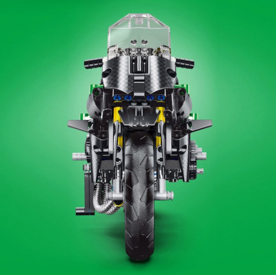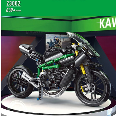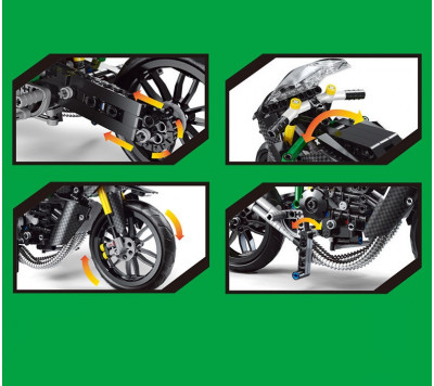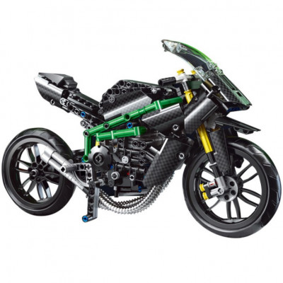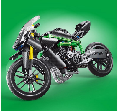 Конструктор «Мотоцикл Кавасаки H2R Ninja», разработанный фабрикой Моулд Кинг — высококачественный набор серии Техник, полностью совместимый с Лего. MOC модель от известного дизайнера Nemooz точно повторяет черты легендарного спортбайка с рекордом скорости в 400 км/ч. Гоночный мотоцикл черно-зеленого цвета оснащен вращающимися большими колесами с резиной для треков, действующей цепной трансмиссией и откидывающейся подножкой для парковки. Пополняйте свою коллекцию легендарной техники с нашим интернет-магазином.