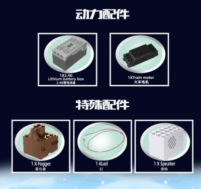 Конструктор имеет LED-подсветку, имитирующую свет фонарей и парогенератор, создающий эффект дыма за счет испаряемой в резервуаре воды.