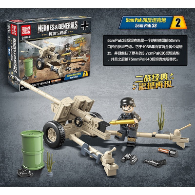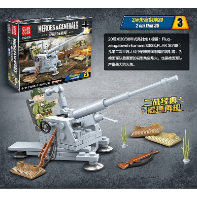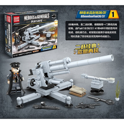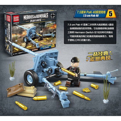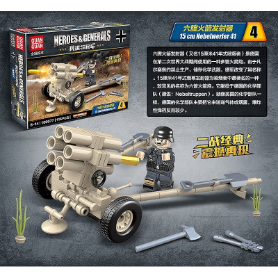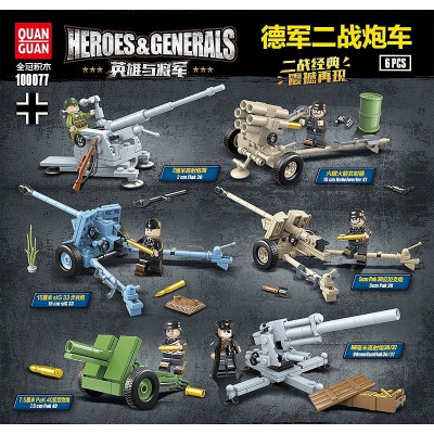 Набор из шести мини-конструкторов представляет уменьшенные варианты германского «Бога войны». В комплекте копии реальных орудий различного целевого назначения: противовоздушные, противопехотные, противотанковые. В состав конструктора 100077 Quanguan Немецкие артиллеристы даже включена модель довоенной немецкой реактивной установки, которую немцы изначально планировали использовать в химических войсках. Так что у ребёнка после завершения строительно-сборочных работ появится великолепная возможность изучить тяжёлое вооружение Германии, а также снаряжение немецких артиллеристов.