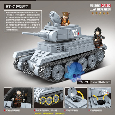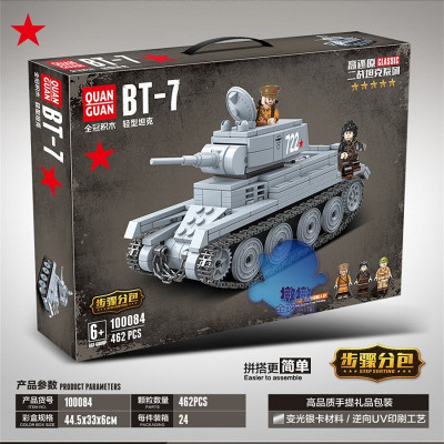 Боевая машина из конструктора 100084 Quanguan Танк BT-7 отличается достаточно высоким корпусом и наличием люка из него, расположенным сзади башни. Для его открытия нужно было разворачивать башню. Ребёнок сможет с ним разыгрывать танковые сражения, сделав их реалистичными благодаря множеству функциональных «фишек»: башня и орудие меняют своё положение, гусеницы «рабочие», люки открываются.