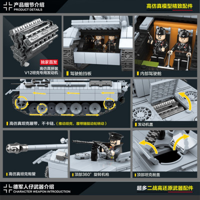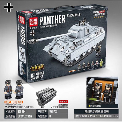 В комплекте вооружения у модели из конструктора 100064 Quanguan Танк «Пантера» имеется крупнокалиберный пулемёт на башне и отдельно рядом с водительским отсеком. У танка открывающиеся люки в башне и передней части. Открывается и крышка моторного отсека, так что в случае необходимости возможно проведение ремонта.