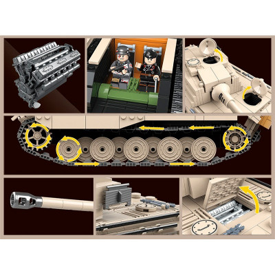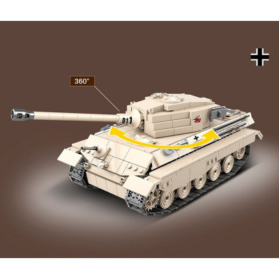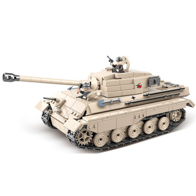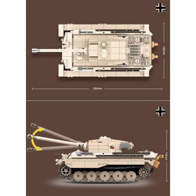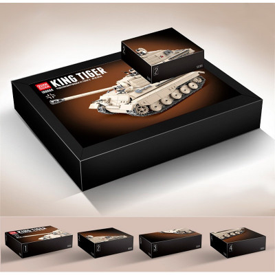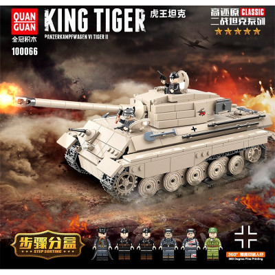Рассматривая громоздкую форму игрушки из конструктора 100066 Quanguan Немецкий тяжёлый танк Королевский Тигр (King Tiger), можно представить, какой большой вес был у оригинала. Действительно, укрепление брони увеличило защитные свойства танка, но одновременно сказалась на его маневренности. Если сравнивать с предшественником, то он потерял в скорости движения по шоссе на 5 км/ч, по пересечённой местности – на 10, плюс запас хода стал меньше 50 км. В этом плане наши «тридцатьчетвёрки» превосходили «Королевские тигры» и получали преимущество, даже объективно уступая в боевой мощи. Почему бы им не сразиться и на игрушечном поле?