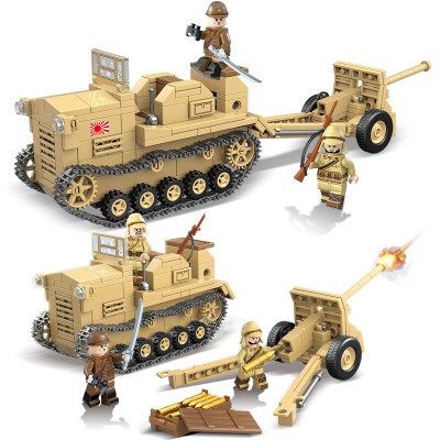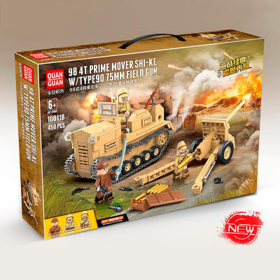 На этот раз создатели сборных наборов военной тематики решили познакомить детей с вооружением Японии. В качестве образца при разработке конструктора 100118 Quanguan Японский артиллерийский тягач (Тип 98 4t Prime Mover Shi-Ke) и полевая пушка (Тип 90, 75мм) были взяты модели настоящей боевой техники. Поэтому собранные игрушки получаются очень реалистичными по своему виду и устройству. Самая большая модель представляет армейский орудийный 4-тонный гусеничный тягач 98 серии «Ши-Ке». По классификации его относят к лёгким типам вооружения, предназначенным для буксирования 75-мм полевой пушки Тип 90 – её модель также включена в игровой комплект.