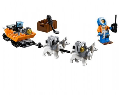 Также в наборе Вы найдёте небольшие сани, запряжённые четвёркой собак породы Хаски, и ящик с инструментами.
