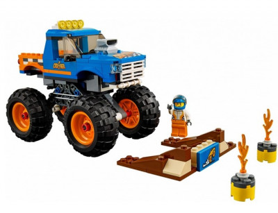 Из деталей набора Вы сможете собрать модель монстр-трака. Его корпус, выполненный в оранжево-синем цвете, украшен яркими наклейками. Центральное место отведено кабине с тонированным лобовым стеклом. Сняв часть крыши вместе с противотуманными прожекторами, можно заглянуть внутрь и рассмотреть кресло водителя с рулевым управлением.