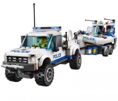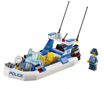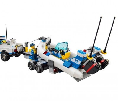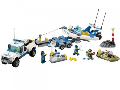 В набор конструктора входят: детали для создания транспортировщика с катером и моторной лодки, двух небольших локаций (маяка и полицейского участка) и три фигурки (2 полицейских и воришка).