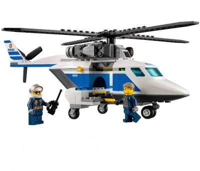 Из деталей набора Вы сможете собрать полицейский вертолёт. Его фюзеляж выполнен из бело-синих деталей с добавлением наклеек и логотипов. Спереди располагается кабина с голубоватым закруглённым стеклом. Сняв часть крыши, можно заглянуть внутрь и рассмотреть место пилота и приборную панель. За кабиной устроен просторный грузовой отсек. Он предназначен для перевозки специального оборудования или одного полицейского, участвующего в погоне.