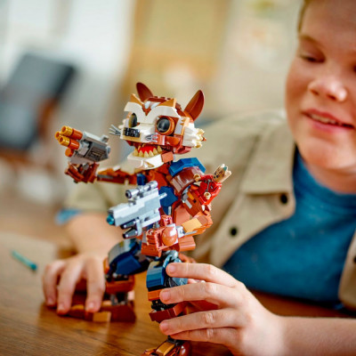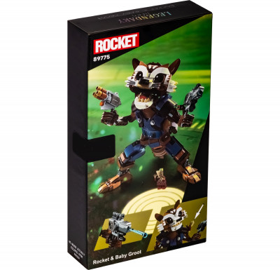 • Сборка включает в себя Ракету с подпружиненным шутером и бластером, а также минифигурку Малыша Грута, который сидит у него на плече.