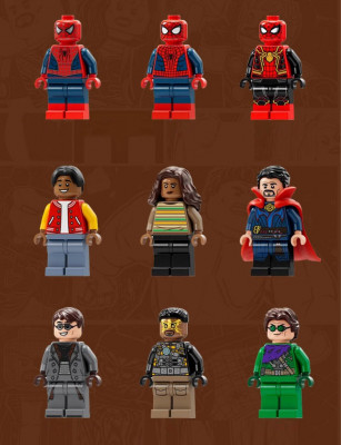 - Знаковые персонажи — Дружелюбный сосед Человек-паук (Тоби Магуайр), Новый Человек-паук (Эндрю Гарфилд), Человек-паук (Том Холланд), Электро (Electro), Доктор Стрэндж (Doctor Strange), Зеленый Гоблин (Green Goblin), Нед (Ned), Эм-Джей (MJ) и Док Ок (Doc Ock)