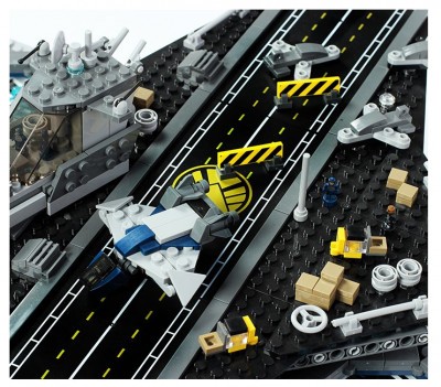 Собранный авианосец вы сможете дополнить тремя квинджетами, тремя реактивными истребителями, бензовозом и двумя автопогрузчиками, которые входят в комплект.