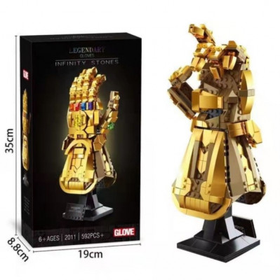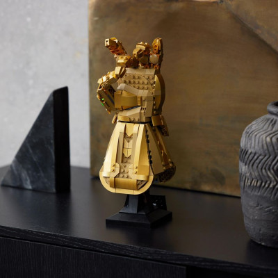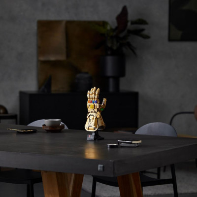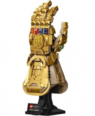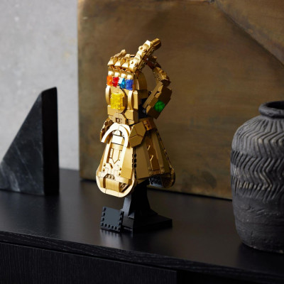 Из деталей набора собирается эксклюзивная, отлично детализированная модель Перчатки бесконечности. Перчатка выполнена из деталей золотого и бежевого цветов. Модель имеет подвижные пальцы, фаланги которых собраны с использованием шарнирных соединений, поэтому без труда можно воссоздать щелчок пальцев Таноса за миг до катастрофы вселенского масштаба. В тело Перчатки инкрустированы Камни бесконечности, выполненные из разноцветных деталей. Каждый из них занимает свое место, точь-в-точь такое же, как это показано в фильмах киновселенной Marvel.