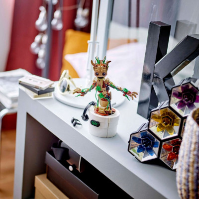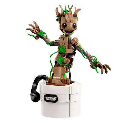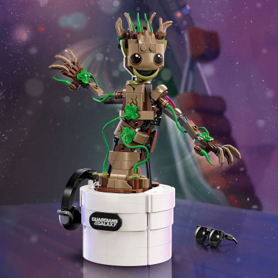 • Танцующий супергерой: в набор входит сборная фигурка Грута в цветочном горшке, 3 разные таблички с именем, которые можно прикрепить к горшку, а также аксессуары, в том числе наушники, солнцезащитные очки и дополнительные листья.