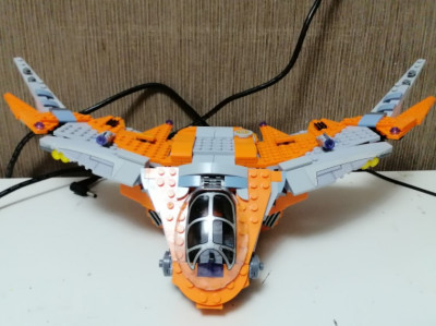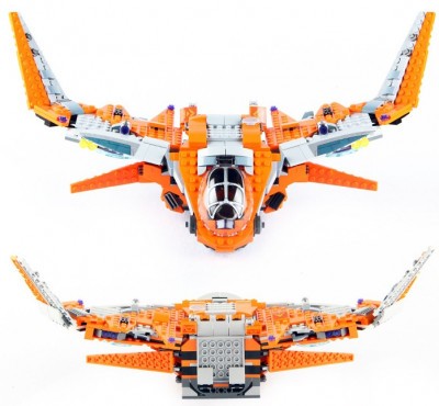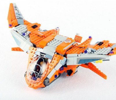 Из деталей набора Вы сможете собрать модель звездолёта Стражей Галактики. Его фюзеляж выполнен в оранжево-сером цвете с добавлением оригинальных наклеек. Спереди располагается массивная кабина, прикрытая обрекаемым прозрачным стеклом. Подняв его вместе с элементами бронированной обшивки, можно получить доступ к интерьеру. Внутри достаточно пространства для хранения и транспортировки космического скутера. На нём Звёздный Лорд и Гамора могут покидать звездолёт, прихватив с собой всё необходимое оружие.