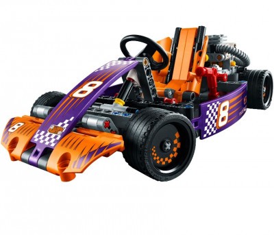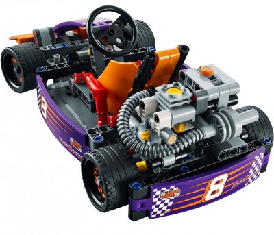 Гоночный карт из набора представляет собой транспортное средство, созданное специально для скоростных заездов и соревнований. Его корпус выполнен из серо-чёрных деталей с добавлением контрастных оранжевых и фиолетовых элементов, украшенных наклейками. Спереди закреплён массивный спойлер, защищающий машину при столкновении. За ним видна просторная кабина, окружённая дугообразными бамперами.