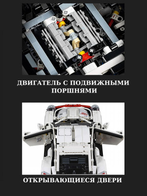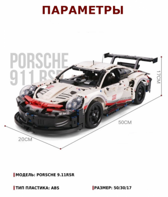 В этом наборе находятся детали для создания потрясающей копии известного автомобиля, которая ко всему прочему ещё является самой крупной в серии «Техник» за последнее время. Прототипом этого игрушечного «Порше» стала настоящая спортивная модель, созданная для гонок. Аналог после сборки будет выглядеть точно таким, каким вы видите его на фронтальной стороне фирменной упаковки.