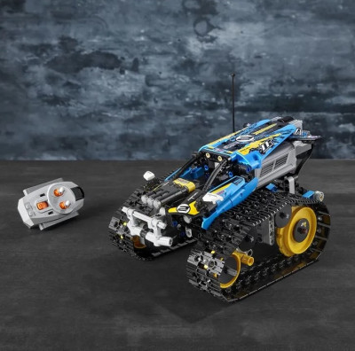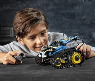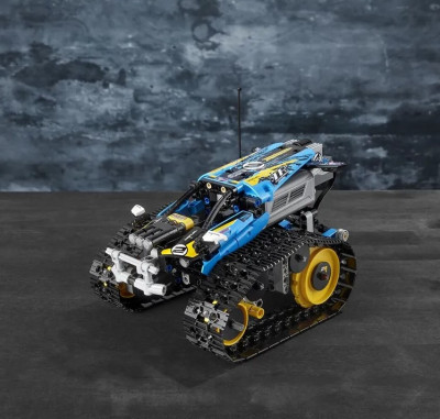 В наборе Вы найдёте модель надёжного и проходимого внедорожника. Его красно-серый корпус украшен наклейками и логотипами. Центральное место занимает вместительная кабина. Она оборудована открывающимися дверями, удобным водительским креслом, рулём и голубыми сигнальными огнями. На крыше установлен вращающийся рычаг. Связанный с передними колёсами, он выполняет функцию рулевого механизма. Поворачивая его влево и вправо, можно понаблюдать, как плавно машина будет входить в повороты.