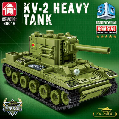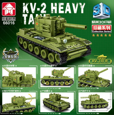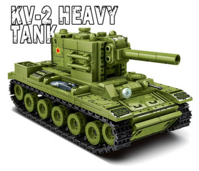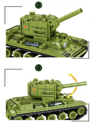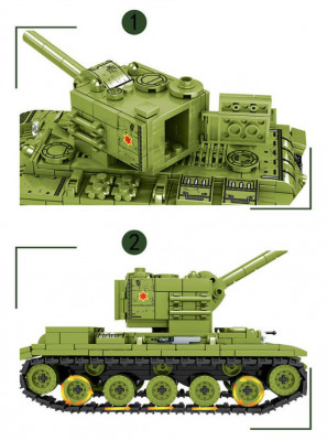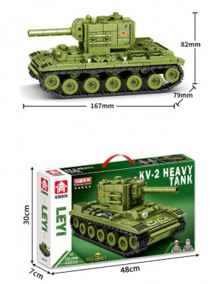 На лицевой стороне фирменной коробки этого набора вы видите изображение легендарного танка времён Великой Отечественной войны КВ-2, или Клим Ворошилов. Его башню украшает красная звёздочка. Таких бронемашин было выпущено в 1940-1941 годах всего 204 единицы. Этот тяжёлый штурмовой танк остался памятной страницей в мировом танкостроении. До 1942 года у напавших на нашу страну фашистов не было бронетехники, равной по техническим и боевым характеристикам КВ-2.
